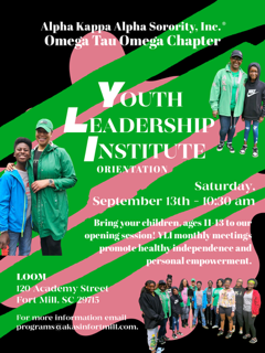 The AKAs in Fort Mill are ready for another season of our Youth Leadership Institute (YLI)! This free, youth-led and highly interactive leadership development program empowers and engages youth, ages 11-13. YLI features programs, workshops and field trips for middle school youth related to stem, the environment, culture and careers. Students will hone their leadership styles and skills, and participate in community service opportunities. Join us at the LOOM, Saturday, September 13th at 10:30 am for orientation and our opening session!